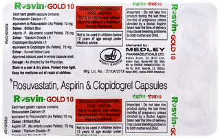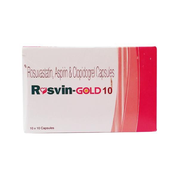 Rosvin Gold Ten Capsule is a combination medicine designed to protect the heart and blood vessels in patients who are at risk of serious cardiovascular complications. It usually contains rosuvastatin, aspirin, and clopidogrel which together provide cholesterol reduction, blood thinning, and prevention of clot formation. Rosuvastatin works by lowering harmful cholesterol and triglycerides while raising protective cholesterol. Aspirin helps by reducing platelet stickiness and lowering the risk of clot formation. Clopidogrel further strengthens the antiplatelet effect, providing protection against blocked arteries. This triple action helps to reduce the risk of heart attack, stroke, and other circulation related issues. Doctors generally prescribe Rosvin Gold Ten Capsule for patients who have high cholesterol along with a previous history of heart disease or increased chances of clotting. Along with diet control, exercise, and medical supervision, this capsule supports long term heart health and maintains smooth blood circulation.