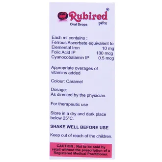 Rubired Paediatric Drops is a nutritional supplement formulated for children. It helps in managing iron deficiency and anemia, supports healthy growth, and improves energy levels. It is enriched with iron, vitamins, and other essential nutrients required for proper development in growing children.