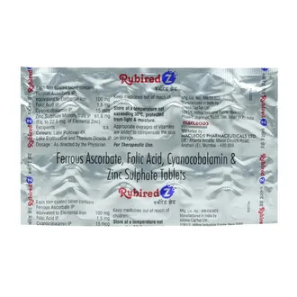 Rubired Z Tablet is a nutritional supplement specially formulated with iron, folic acid, vitamin B12, and zinc to treat and prevent anemia caused by multiple nutrient deficiencies. It is commonly prescribed to individuals suffering from fatigue, weakness, and low hemoglobin levels. This tablet not only helps in restoring healthy red blood cell production but also supports the immune system, promotes faster healing, and maintains proper body functions. The addition of zinc further enhances its benefits by improving immunity, supporting growth, and aiding in tissue repair. Rubired Z Tablet is particularly useful for pregnant and lactating women, growing children, adolescents, and patients recovering from chronic illness or surgery. Regular use as per medical guidance helps in replenishing essential vitamins and minerals, improving oxygen transport, and maintaining overall energy levels. It is an effective supplement to prevent anemia, boost strength, and support daily health needs.