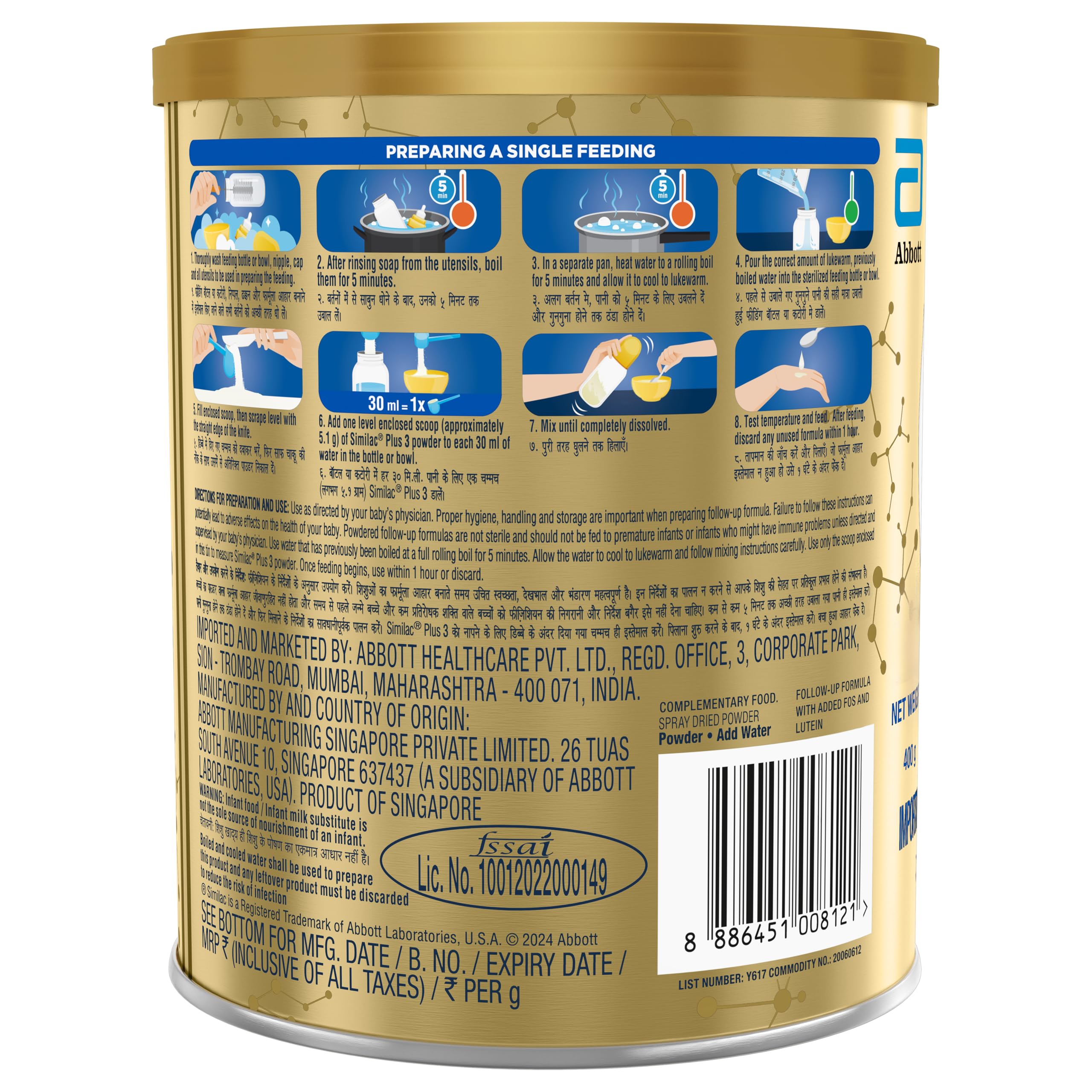 Similac Plus Stage 3 Follow-Up Formula is a spray-dried milk substitute formulated for toddlers aged 12 to 24 months. It supports overall physical and mental development during the weaning phase. This formula provides essential nutrients including Human Milk Oligosaccharides (HMO), nucleotides, DHA, Lutein, Natural Vitamin E, Omega-3 and Omega-6 fatty acids, Arachidonic Acid (AA), and key minerals such as choline, iron, taurine, iodine, folic acid, and zinc. These components work together to support the immune system, brain function, and vision development in growing toddlers.