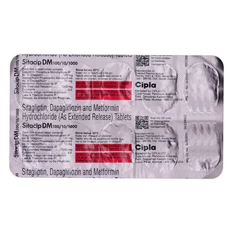 Sitacip DM 10mg/1000mg/100mg Tablet ER helps manage type 2 diabetes by lowering high blood sugar levels through multiple mechanisms. It promotes glucose removal through urine, enhances insulin sensitivity, and reduces glucose production in the liver. Consistent use helps prevent diabetes-related complications like kidney, nerve, and heart problems, and supports long-term metabolic health.