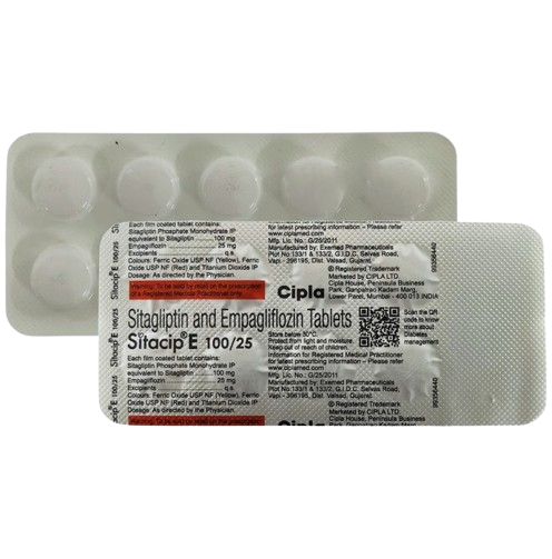 SitaCIP E 25mg/100mg Tablet contains two active ingredients — Empagliflozin and Sitagliptin — which help control blood sugar levels in people with type 2 diabetes.