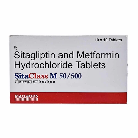 Sitaclass M 50mg/500mg Tablet is a combination medicine prescribed for the effective management of type two diabetes mellitus. It contains Sitagliptin, which belongs to the class of DPP-4 inhibitors, and Metformin, a biguanide, working together to regulate blood sugar levels when lifestyle changes and single-drug therapy are not sufficient. Sitagliptin helps stimulate insulin release after meals and reduces sugar production, while Metformin decreases glucose formation in the liver and improves insulin sensitivity in body tissues. This dual action helps maintain stable glucose levels throughout the day, preventing sudden highs and lows. Sitaclass M 50mg/500mg Tablet not only lowers the risk of long-term diabetes-related complications such as kidney issues, nerve damage, and eye problems, but also supports healthy weight control and better energy levels. With proper diet, exercise, and lifestyle changes, it ensures holistic diabetes care and improves overall quality of life.