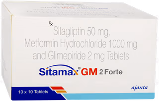 Sitamax GM 2 Forte Tablet is a combination medication used to help manage type 2 diabetes mellitus. It contains three active ingredients that work together to reduce high blood sugar levels. This combination is typically prescribed when other treatments such as diet, exercise, or single medications are not providing sufficient control. This medicine should be taken with meals to reduce the risk of side effects and to enhance its effectiveness. It’s important to take it consistently at the same time each day as advised by your doctor. Regular monitoring of blood sugar levels may be necessary during treatment. Even if your blood sugar seems controlled, continue taking this medication unless directed otherwise by your healthcare provider. Abruptly stopping it may cause your glucose levels to rise, increasing the risk of diabetes-related complications. It should always be used alongside lifestyle changes like healthy eating, regular physical activity, and weight management. Sitamax GM 2 Forte Tablet helps in achieving better glycemic control and lowers the risk of long-term complications. When combined with a healthy lifestyle, it can significantly improve your overall health and well-being. This tablet combines three anti-diabetic agents: Sitagliptin enhances the action of incretins, hormones that stimulate insulin release and reduce glucose production by the liver. Glimepiride encourages the pancreas to release more insulin and helps the body use insulin more effectively. Metformin lowers the amount of glucose produced by the liver, decreases sugar absorption from food, and improves insulin sensitivity. Most side effects are mild and temporary. However, if they persist or worsen, consult your doctor. Common side effects include low blood sugar (hypoglycemia), nausea or vomiting, headache, diarrhea or constipation, abdominal discomfort, and digestive issues. Take this medicine exactly as prescribed. Swallow the tablet whole with food. Do not chew or crush it. Follow your doctor’s instructions regarding dosage and duration. Avoid alcohol while taking this medicine, as it may increase the risk of low blood sugar and other side effects. Consult your doctor if you are pregnant or breastfeeding. This medicine may not be suitable in these conditions. Be cautious when driving or operating machinery, especially if you experience symptoms of low or high blood sugar, such as dizziness or blurred vision. Use with caution if you have kidney or liver problems. Your doctor may need to adjust the dosage accordingly. Do not use this medicine if you have type 1 diabetes, diabetic ketoacidosis, a history or presence of bladder cancer, or severe kidney or liver impairment. If you forget to take a dose, take it as soon as you remember. If it’s nearly time for the next dose, skip the missed one. Do not double the dose to make up for it.