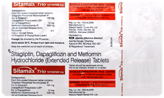 Sitamax Trio 10mg/500mg/100mg Tablet is a combination medication formulated to help manage type 2 diabetes mellitus in adults. It works by enhancing insulin utilization, promoting the elimination of excess glucose through urine, and reducing the production of sugar in the body. When used alongside a proper diet and regular physical activity, it supports better blood sugar control and may help reduce the risk of serious diabetes-related complications like vision loss, kidney problems, and nerve damage.