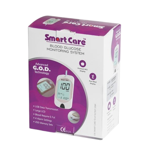 The Smart Care Blood Glucose Monitor is a reliable, user-friendly device designed for accurate and convenient blood sugar monitoring. With a requirement of just 0.7 µl of blood, it ensures painless and minimal sampling.