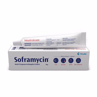 Soframycin Multi-Purpose Antiseptic Cream is a broad-spectrum antibiotic cream used in the treatment of bacterial skin infections, including infected cuts, wounds, minor burns, boils, impetigo, and skin ulcers. It works by stopping the growth of infection-causing bacteria, thereby helping to heal the skin and relieve symptoms such as pain, redness, swelling, and irritation.
