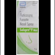 Solspre F Mist Nasal Spray is a corticosteroid medication used to alleviate symptoms associated with allergic rhinitis, including sneezing, runny nose, and sinus discomfort. It works by inhibiting the release of certain chemical substances in the body responsible for inflammation and allergic reactions, thereby reducing nasal irritation and swelling.