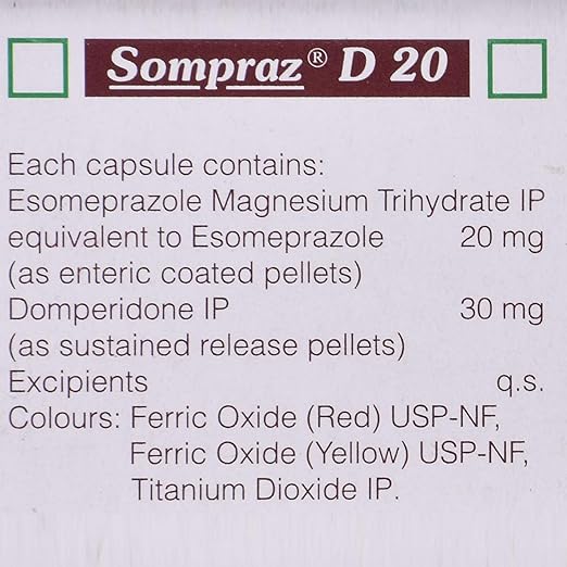 Sompraz D 20 Capsule SR is prescribed for individuals dealing with gastroesophageal reflux disease (GERD), a condition often linked with acid reflux. It eases discomfort such as burning in the chest, stomach irritation, and pain. By lowering the acid levels in the stomach and supporting smooth passage of gas, it provides relief from digestive uneasiness.