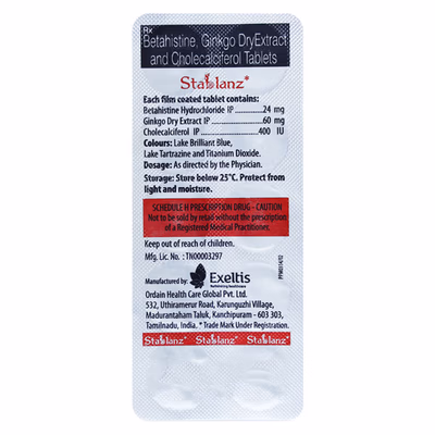 Stablanz Tablet combines Betahistine, which increases blood flow in the inner ear and reduces fluid pressure, with Ginkgo Biloba, which enhances cerebral circulation and protects nerve cells from damage caused by free radicals. Together, they help restore balance, relieve dizziness, and support brain health.
