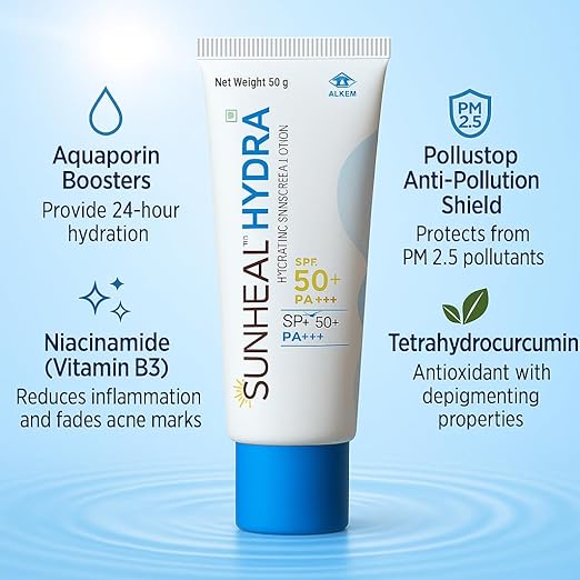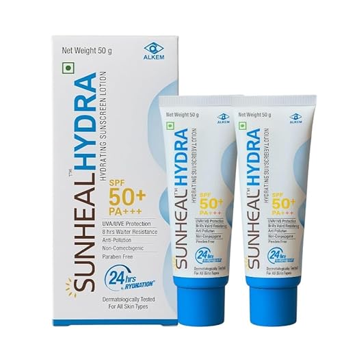 Sunheal Hydra Sunscreen Lotion SPF 50+ offers broad-spectrum defense against harmful UVA and UVB rays, helping to reduce the risk of sunburn and long-term skin damage. Enriched with hydrating ingredients, it locks in moisture to keep skin soft and comfortable with a lightweight, non-greasy finish. Designed for daily wear, this sunscreen is suitable for all skin types and supports overall skin health by combining sun protection with lasting hydration.