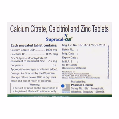 Supracal OS Tablet is a specialized supplement designed to support bone health and prevent osteoporosis. It combines calcium citrate, calcitriol (active Vitamin D3), and zinc to strengthen bones, enhance calcium absorption, and support bone repair. By maintaining healthy calcium levels and promoting bone cell activity, it helps reduce the risk of fractures and improves overall skeletal strength.