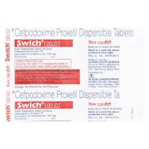 Swich 100 DT Tablet is an antibiotic prescribed for the treatment of bacterial infections in the body. It is commonly used for infections of the lungs such as pneumonia, urinary tract infections, sinusitis, throat infections, and ear infections. By killing harmful bacteria, it helps relieve symptoms and speeds up recovery.