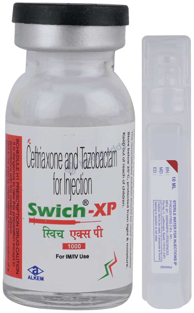 Swich XP 1000mg Injection contains two active components: Ceftriaxone and Tazobactam. Ceftriaxone is a broad-spectrum antibiotic that kills bacteria by blocking the formation of their protective cell wall, which is essential for their survival. Tazobactam is a beta-lactamase inhibitor that prevents bacteria from resisting the antibiotic, thereby strengthening the action of Ceftriaxone. Together, they provide effective treatment for a wide range of bacterial infections.