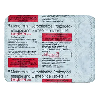 Switglim-M 3mg/500mg Tablet PR is an oral anti-diabetic medication formulated for adults with type 2 diabetes mellitus. It is a powerful combination of Glimepiride (3 mg) and Metformin (500 mg), designed to effectively regulate blood glucose levels when diet and exercise alone are insufficient.