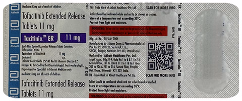 Tacitinix 11mg Tablet ER is a prescription medication used for the management of autoimmune and inflammatory conditions such as rheumatoid arthritis, psoriatic arthritis, ankylosing spondylitis, and ulcerative colitis. It helps in reducing joint pain, stiffness, swelling, and slows down the progression of disease by controlling the body’s immune response. The medicine may be used alone or with other drugs, depending on the severity of the condition. It can be taken with or without food, but it should be taken at the same time every day for best results. You should continue taking it exactly as prescribed by your doctor and should not stop suddenly as it may worsen the condition. The most frequently observed side effects include headache, upper respiratory tract infections, diarrhea, and throat irritation. Though rare, more serious effects such as blood clots or gastrointestinal perforation may occur and require immediate medical attention. It is important to undergo certain blood tests before starting treatment. Inform your doctor if you have existing infections or a history of tuberculosis, liver or kidney problems, shingles, hepatitis B or C, or blood clots. The medicine may increase the risk of infections, so it’s advised to avoid close contact with individuals who have contagious illnesses like flu, measles, or chickenpox. This drug is not suitable for children under 18 and should be avoided during pregnancy and breastfeeding unless clearly directed by a healthcare provider. The medication works by inhibiting Janus kinase (JAK), an enzyme involved in the inflammation process. By blocking this enzyme, it reduces abnormal immune system activity, thereby controlling symptoms and progression of diseases like arthritis and ulcerative colitis. Use the medicine exactly as directed. Swallow the tablet whole without crushing or chewing. If a dose is missed, take it as soon as you remember. If it’s close to the next dose, skip the missed one and continue with your regular schedule. Do not take a double dose. Alcohol does not appear to cause adverse reactions with this medicine. However, use with caution during pregnancy or breastfeeding. Tacitinix should be used carefully in patients with severe kidney or liver conditions, and dose adjustments may be necessary. Always consult your doctor before starting or stopping this medication.