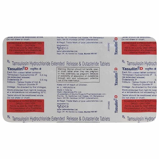 Tasulin-D Tablet ER is a carefully formulated combination therapy designed to ease urinary difficulties caused by an enlarged prostate. By targeting both the size of the prostate and the muscle tension around the bladder, this extended-release tablet improves urine flow, reduces urinary urgency, and decreases frequent trips to the bathroom. Note that it does not prevent or treat prostate cancer.