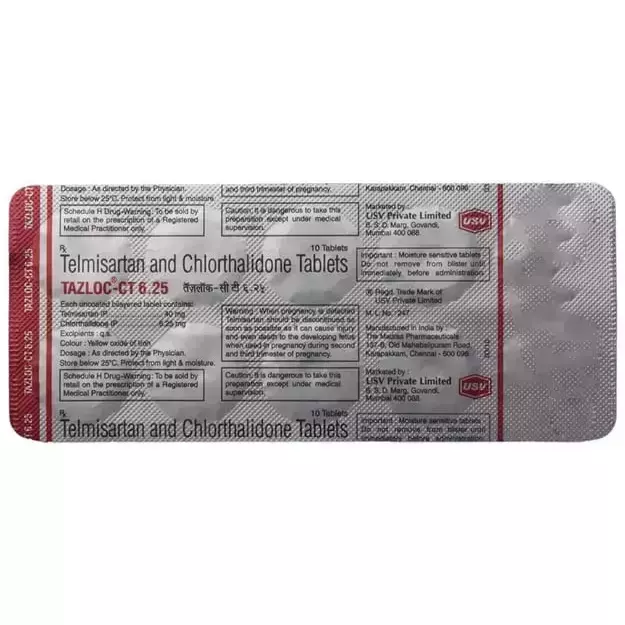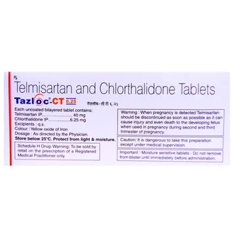 TAZLOC-CT 6.25 Tablet, TAZLOC CT 6.25, Telmisartan Chlorthalidone Tablets, Hypertension Combination Tablets, High Blood Pressure Management, Antihypertensive Combination Therapy, Diuretic and ARB Tablet, Cardiovascular Health Medication, Blood Pressure Control Tablets, TAZLOC-CT for Hypertension, Telmisartan 40mg + Chlorthalidone 6.25mg.