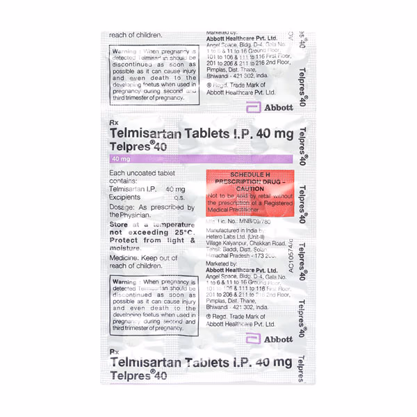 Telpres 40 belongs to a class of drugs called angiotensin receptor blockers (ARBs). It works by blocking a chemical that causes blood vessels to narrow, allowing vessels to relax, lowering blood pressure, and improving blood flow to vital organs.