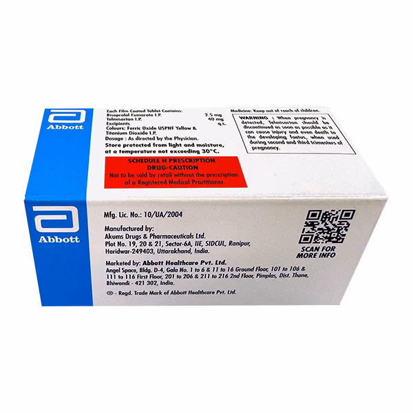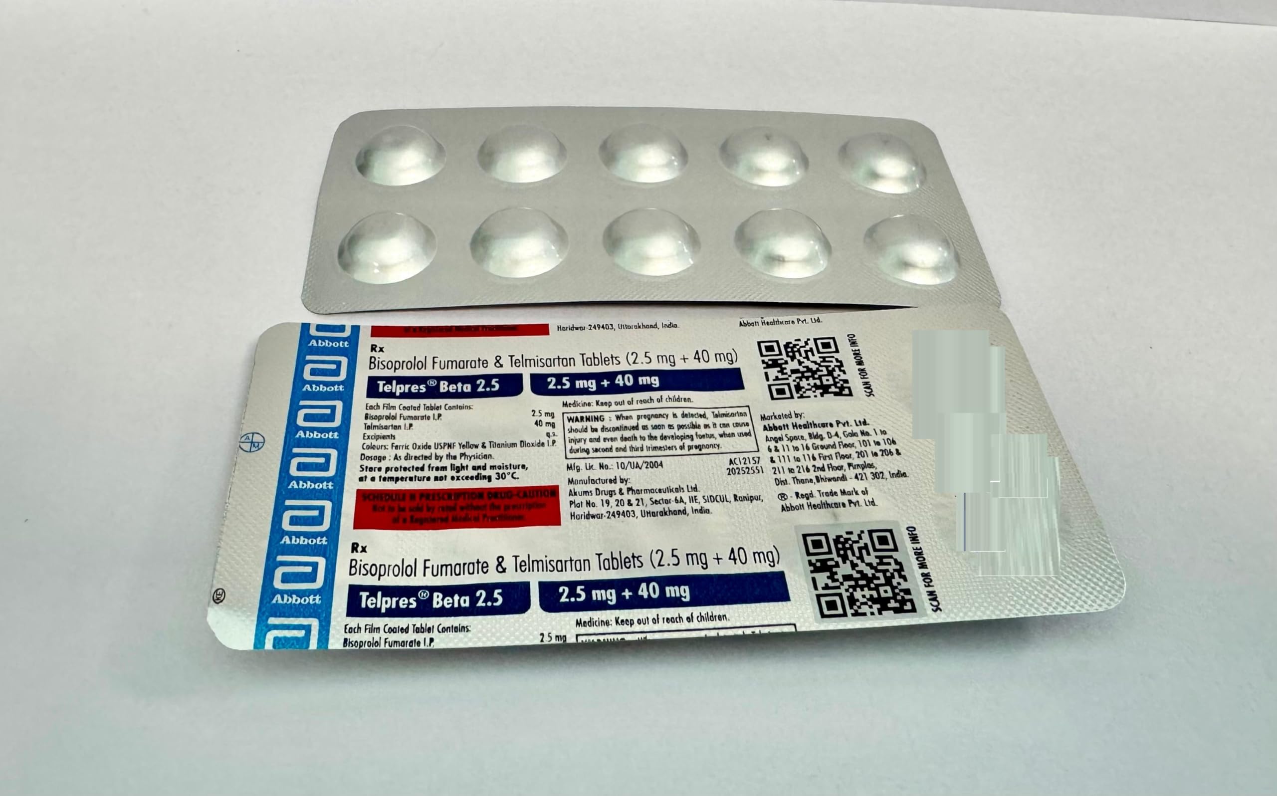 This tablet combines Bisoprolol, a beta-blocker that slows the heart rate and reduces blood pressure by acting directly on the heart, with Telmisartan, an angiotensin receptor blocker (ARB) that relaxes blood vessels by blocking a hormone that causes blood vessels to narrow. Together, they improve blood flow and help lower blood pressure effectively.