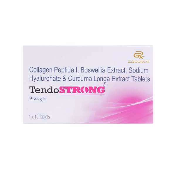 Tendostrong Tablet 10 is a targeted supplement for bone and joint wellness, designed to support cartilage health, reduce inflammation, and improve joint mobility. With Curcumin, Collagen Peptide Type II, Chondroitin Sulphate, Sodium Hyaluronate, Vitamin C, Boswellia, and Rosehip extract, it helps maintain joint comfort, flexibility, and structural integrity. Regular use may aid in managing mild osteoarthritis symptoms, supporting cartilage regeneration, and promoting overall musculoskeletal health.