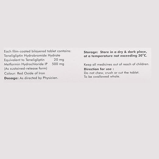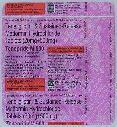 Tenepride M 500 Tablet PR is a medication combining two active ingredients that help manage high blood sugar in individuals with type 2 diabetes. By controlling blood glucose, it helps lower the risk of severe diabetes-related complications, including kidney problems, vision impairment, heart attacks, and strokes.