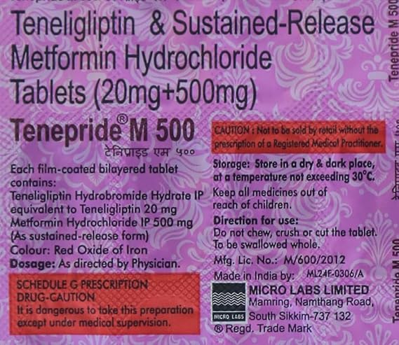 Tenepride M 500 Tablet PR contains two antidiabetic agents that work in complementary ways to lower blood glucose.