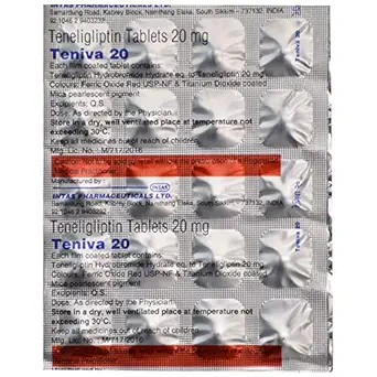 Teniva 20 Tablet is a medication used to manage type 2 diabetes mellitus. It works best when combined with a proper diet and regular physical activity to help regulate blood sugar levels. Keeping your blood sugar under control can prevent serious health issues such as kidney problems, vision loss, and nerve damage.