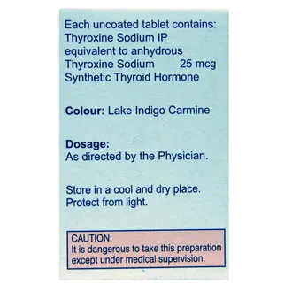 Thyrox 25 Tablet is a prescription medicine used for the treatment of hypothyroidism, a condition where the thyroid gland produces insufficient amounts of thyroid hormones. It contains Levothyroxine Sodium, a synthetic version of the natural thyroid hormone thyroxine (T4). This medicine helps restore normal hormone levels in the body, regulating metabolism, energy production, and essential physiological processes. Thyrox 25 Tablet is commonly prescribed for patients with thyroid hormone deficiency, goiter, or certain thyroid nodules. By correcting hormone imbalance, it helps alleviate symptoms such as fatigue, weight gain, cold intolerance, slow heart rate, and mental sluggishness. Regular use under medical supervision ensures proper thyroid function, supports metabolism, and improves overall health and quality of life.