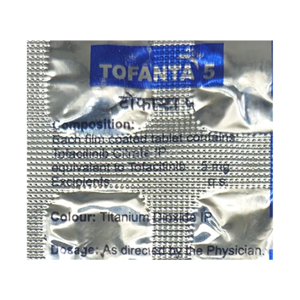 Tofanta 5 New Tablet is a prescription medicine used for the treatment of autoimmune and inflammatory conditions such as rheumatoid arthritis, psoriatic arthritis, and ulcerative colitis. It contains Tofacitinib, a Janus kinase (JAK) inhibitor that works by blocking certain enzymes involved in the body’s immune response, thereby reducing inflammation, joint pain, swelling, and other symptoms associated with these chronic diseases. This medication helps patients who have not responded adequately to traditional treatments like methotrexate or other disease-modifying antirheumatic drugs (DMARDs). Tofanta 5 New Tablet should be taken exactly as prescribed by your doctor. It can be taken with or without food and must be swallowed whole with a glass of water. Do not crush, chew, or break the tablet. The dose and duration will be based on your specific condition and response to therapy. Common side effects include headache, diarrhea, nausea, vomiting, cold-like symptoms, and upper respiratory tract infections. Most side effects are mild and temporary, but you should consult your doctor if they persist or become bothersome. You should avoid this medication if you are allergic to Tofacitinib or any other ingredient in the tablet, or if you have a serious infection, severe liver problems, or a weakened immune system. Inform your healthcare provider about any ongoing infections, history of tuberculosis, liver or kidney issues, blood disorders, or if you are taking immunosuppressants, corticosteroids, or planning to receive any vaccinations. Tofanta 5 New Tablet is not recommended during pregnancy or while breastfeeding unless clearly directed by a physician. It is also not advised for use in children under 18 years of age due to a lack of established safety and efficacy data. Store the tablets in a cool, dry place, away from direct sunlight and out of reach of children. The recommended storage temperature is between 10°C to 25°C and should not exceed 30°C. In case of an overdose, seek immediate medical attention and do not attempt to take more than the prescribed dose. While on this medication, maintaining a healthy lifestyle can support treatment outcomes. Regular low-impact exercise such as walking or swimming may help relieve joint stiffness, while a diet rich in antioxidants and anti-inflammatory foods like berries, leafy greens, and green tea can be beneficial. Avoid smoking and alcohol, and practice stress-relieving techniques such as yoga, meditation, or listening to soothing music. This medication does not have any known habit-forming potential. Tofanta 5 New Tablet falls under the therapeutic class of antirheumatics, specifically disease-modifying antirheumatic drugs (DMARDs).
