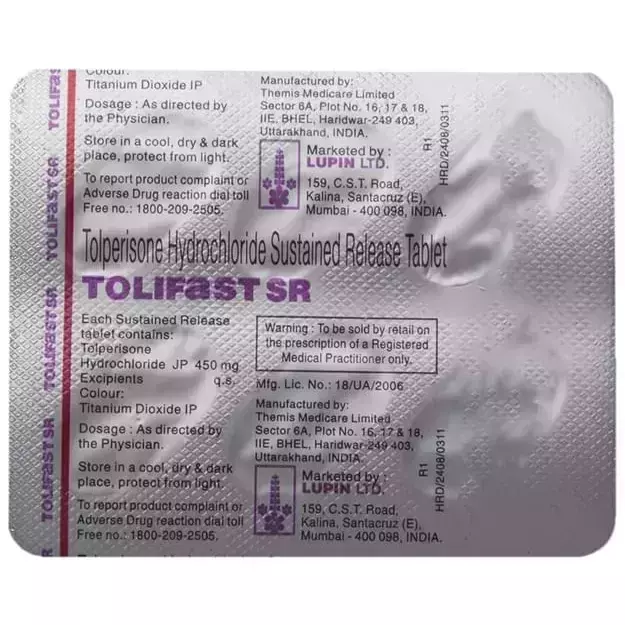 Tolifast SR Tablet is a muscle relaxant commonly prescribed to relieve muscle stiffness, spasms, and pain associated with conditions such as cervical spondylosis, back pain, or other musculoskeletal disorders. It contains Tolperisone, which works by acting on the central nervous system to relax muscles and improve movement. The sustained-release (SR) form ensures a gradual and long-lasting effect throughout the day.
