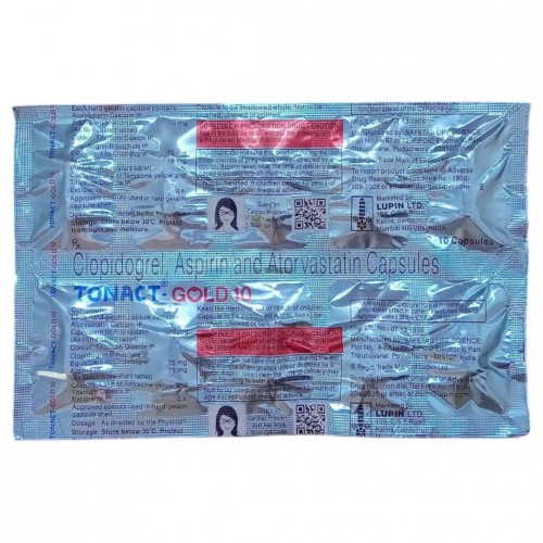 Tonact-Gold 10 Capsule is a combination medicine that helps in the management of cholesterol and prevention of heart-related complications. It usually contains Atorvastatin (a statin for cholesterol control), Aspirin (an antiplatelet agent to prevent clot formation), and Clopidogrel (another antiplatelet agent for enhanced protection). This triple combination works together to lower cholesterol, prevent harmful blood clots, and reduce the risk of heart attack, stroke, and other cardiovascular problems.