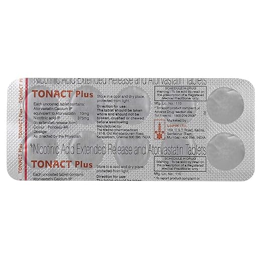 Tonact Plus Tablet ER combines atorvastatin, which inhibits the HMG-CoA reductase enzyme in the liver to reduce cholesterol production, with Vitamin B3 (Nicotinic Acid), which enhances lipid metabolism and supports heart health. This combination helps lower “bad” cholesterol, triglycerides, and supports overall cardiovascular wellness.