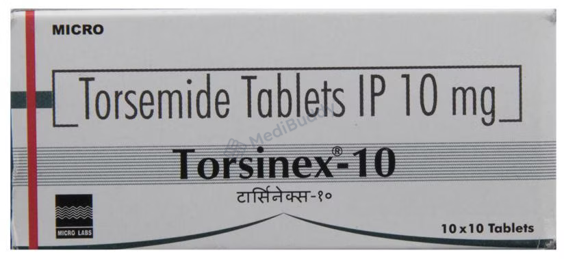 Torsinex 10 Tablet is a type of medicine known as a diuretic, commonly referred to as a water tablet. It is primarily used to reduce swelling caused by fluid buildup in the body, which can occur in conditions like heart failure, liver disorders, or kidney problems. Additionally, it helps in controlling high blood pressure.