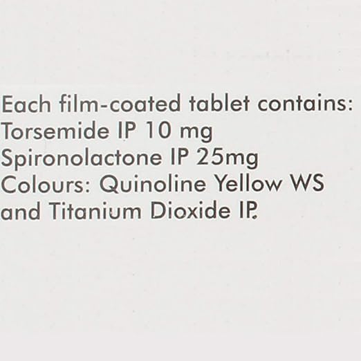 The tablet should be swallowed whole with food and not chewed, crushed, or broken. Its mechanism involves Torasemide, a diuretic that increases salt and water elimination by the kidneys, and Spironolactone, a potassium-sparing diuretic that prevents potassium depletion while also helping remove excess fluid. Together, these ingredients reduce swelling and help maintain blood pressure without significant electrolyte imbalances.