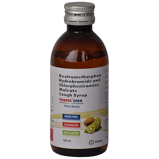 Tossex DMR Syrup Kiwi Sugar Free is a prescription medicine formulated to provide effective relief from dry cough. It combines two active ingredients that work together to soothe throat irritation, reduce sneezing, and alleviate a runny nose caused by cough-inducing conditions. By calming the cough reflex in the brain and blocking histamine activity, this syrup helps manage persistent, tickly coughs.
