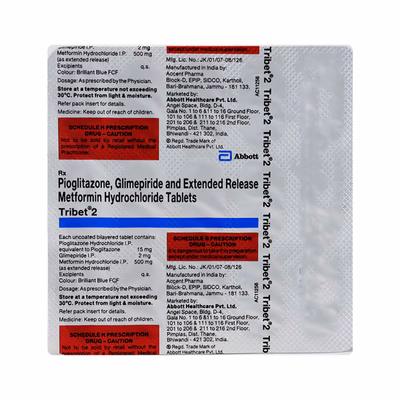 Tribet 2 Tablet ER is a combination anti-diabetic medication used to control blood sugar levels in adults with type 2 diabetes mellitus. It works together with diet and exercise to improve insulin utilization and maintain stable blood glucose levels.