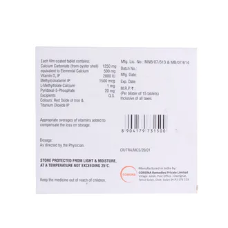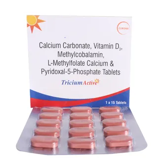 Tricium Active Tablet is a comprehensive vitamin and mineral supplement formulated to promote bone strength, joint flexibility, and overall skeletal health. It combines the power of Calcium, Vitamin D3 (Cholecalciferol), Methylcobalamin, L-Methylfolate, and Pyridoxal-5-Phosphate to support strong bones, healthy muscles, and an active lifestyle.