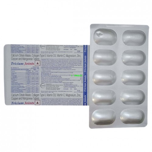 Tricium Joints Tablet is a carefully formulated nutritional supplement that brings together collagen, essential minerals, and key vitamins to promote bone and joint well-being. The blend includes calcium citrate malate, type II collagen, vitamin D3, vitamin C, magnesium, zinc, manganese, and copper. This combination is designed to help maintain cartilage resilience, improve mobility, and provide daily nourishment for strong bones and flexible joints. With type II collagen supporting connective tissues, and calcium and magnesium contributing to skeletal strength, the supplement may be useful for individuals aiming for long-term musculoskeletal comfort and function.
