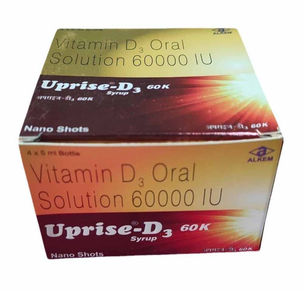 Uprise-D3 60K Syrup Sugar Free is a supplement used to treat vitamin D deficiency and osteoporosis. It helps the body absorb calcium, which is vital for keeping bones strong and healthy. This syrup is recommended when dietary intake of calcium and vitamin D is not enough to meet the body’s needs.