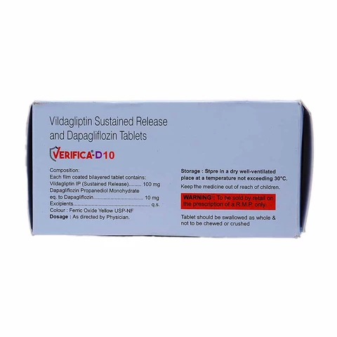 Verifica D 10mg/100mg Tablet SR is a prescription medicine used in the treatment of hypertension (high blood pressure) and related heart conditions. It combines Verapamil (10mg), a calcium channel blocker that relaxes blood vessels and improves heart function, with Diltiazem (100mg), another calcium channel blocker that enhances blood flow and lowers cardiac workload. This dual action helps in effective blood pressure control and prevention of chest pain (angina).
