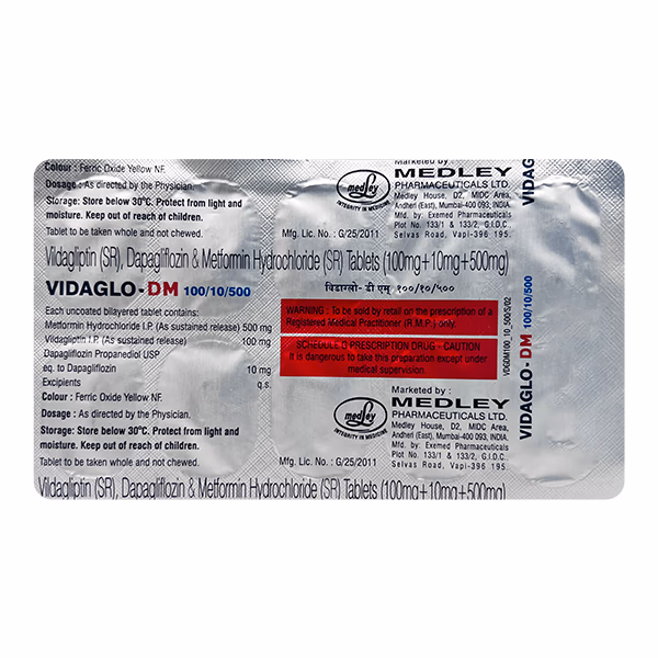 Vidaglo-DM Tablet SR is a prescription medicine formulated for the effective management of type two diabetes mellitus. It contains a combination of three powerful anti-diabetic agents that work together to regulate blood sugar levels more effectively than single therapy. This medicine helps the body to utilize insulin properly, lowers the production of extra glucose from the liver, and reduces absorption of sugar from food. The sustained release action ensures gradual and steady control of sugar levels throughout the day, reducing sudden spikes or drops. By maintaining glucose balance, Vidaglo-DM supports overall health, lowers the risk of long-term complications such as kidney damage, heart problems, and nerve disorders, and helps patients achieve better control even when diet and exercise alone are not enough. Consistent use with medical supervision, along with lifestyle modifications, ensures maximum benefit in diabetes care.