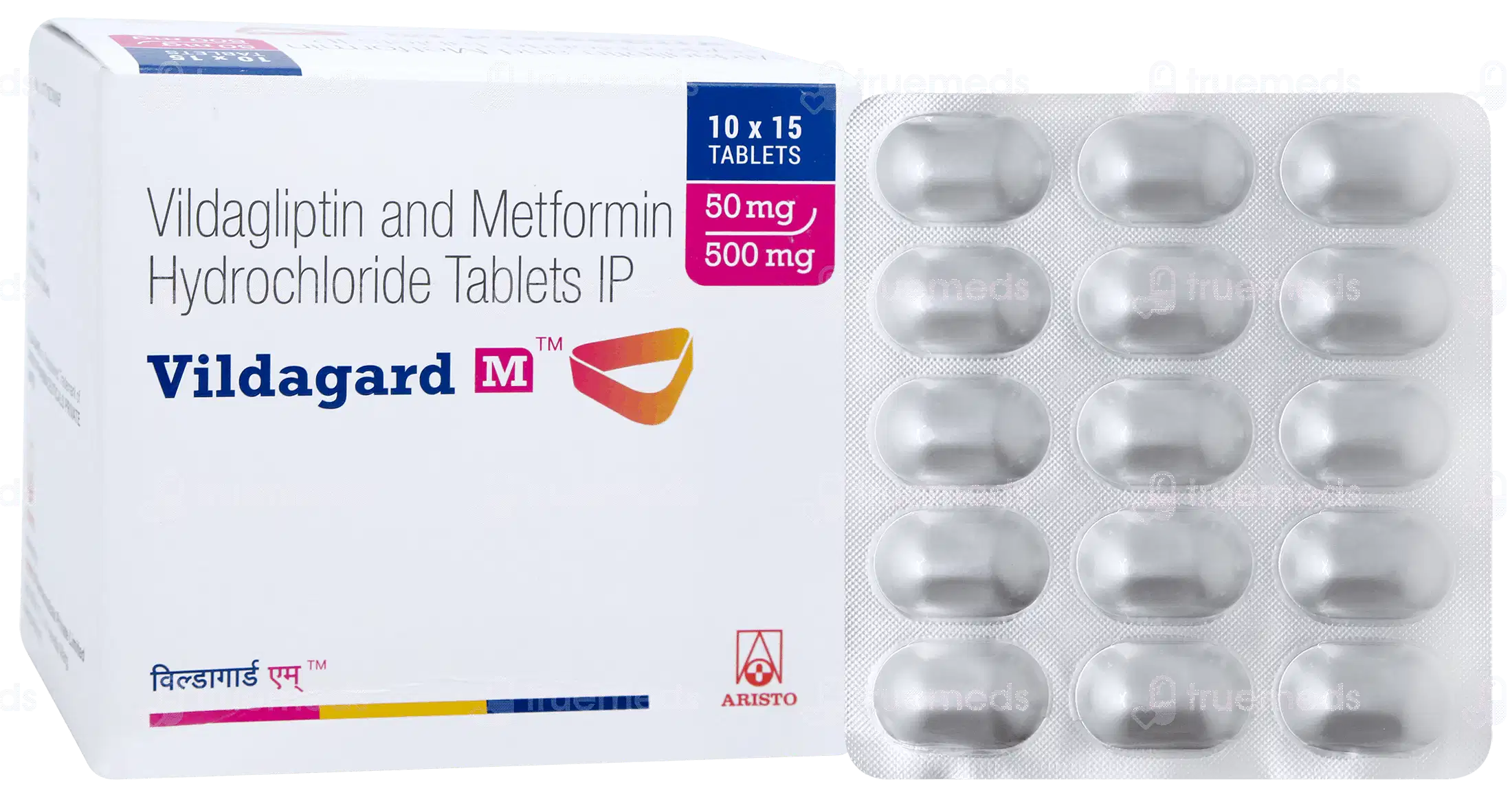 Vildagard M 500mg/50mg Tablet combines metformin and vildagliptin to manage blood sugar in multiple ways. Metformin reduces sugar production in the liver, slows intestinal sugar absorption, and improves the body’s response to insulin. Vildagliptin enhances insulin release from the pancreas and suppresses hormones that increase blood glucose. This combination helps control both fasting and post-meal glucose levels effectively.