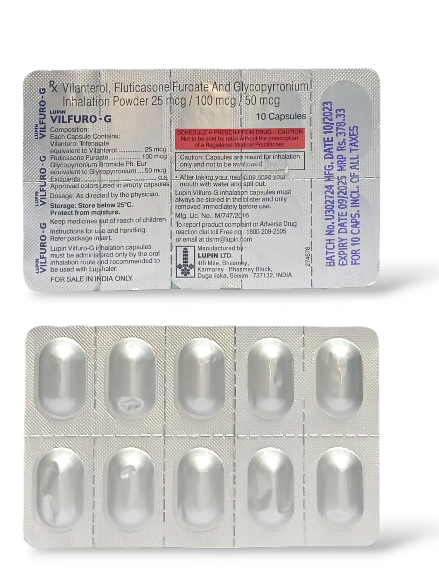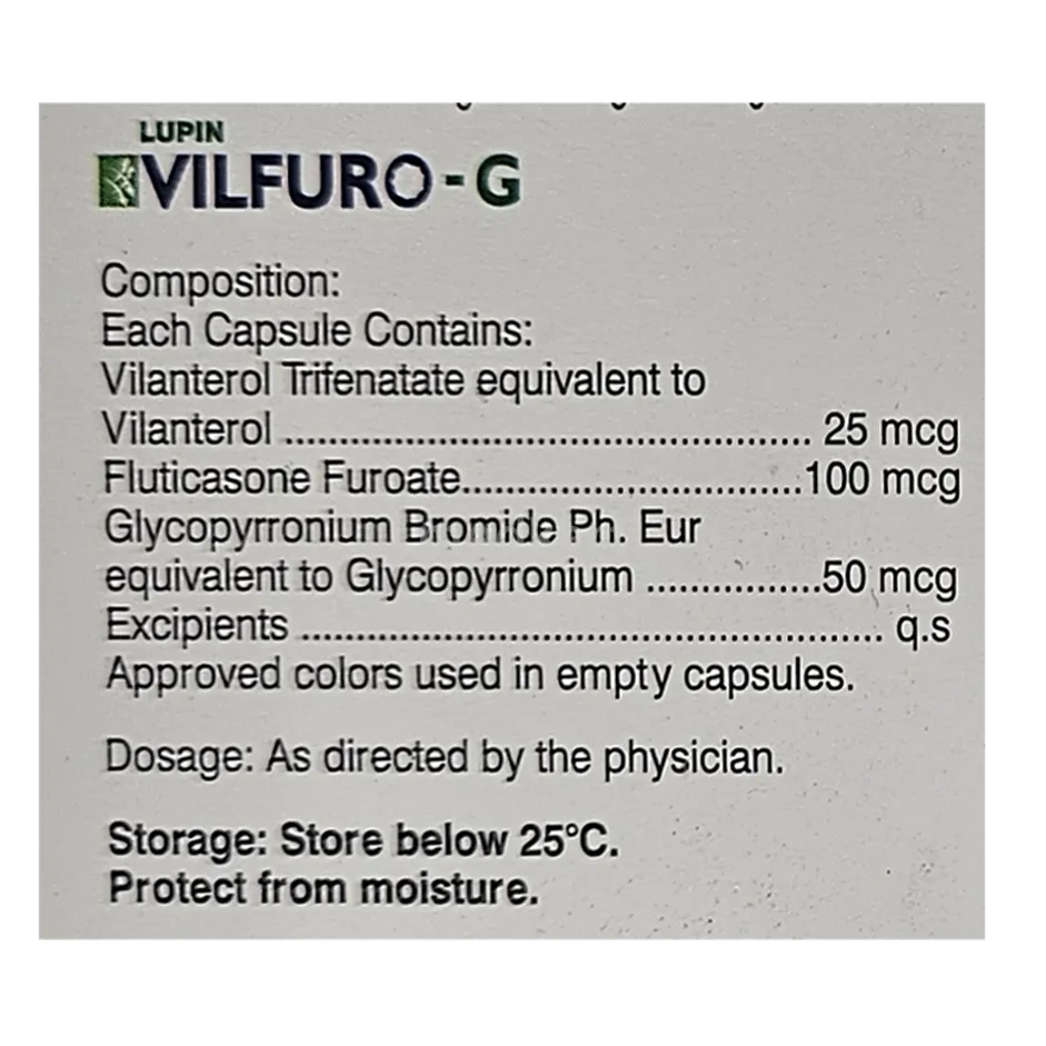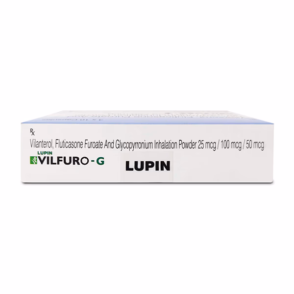 Vilfuro-G Capsule is a prescription medicine used in the management of chronic obstructive pulmonary disease (COPD) and other chronic lung conditions associated with breathing difficulty. It is a combination inhalation therapy that provides both long-acting bronchodilation and protection against airway constriction. By keeping the airways open, it helps patients breathe more comfortably, reduces symptoms such as cough and wheezing, and lowers the chances of flare-ups.