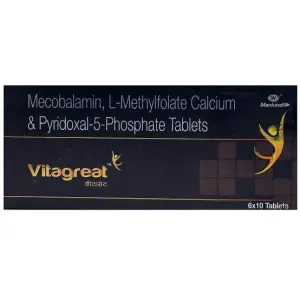 Vitagreat Tablet is a scientifically formulated dietary supplement designed to support blood formation, enhance folate levels, and assist in the healthy functioning of nerve and body cells. Enriched with active forms of essential B-vitamins, this supplement plays a key role in red blood cell production, DNA synthesis, and metabolic processes — making it a vital choice for women with increased nutritional demands or folate deficiencies.