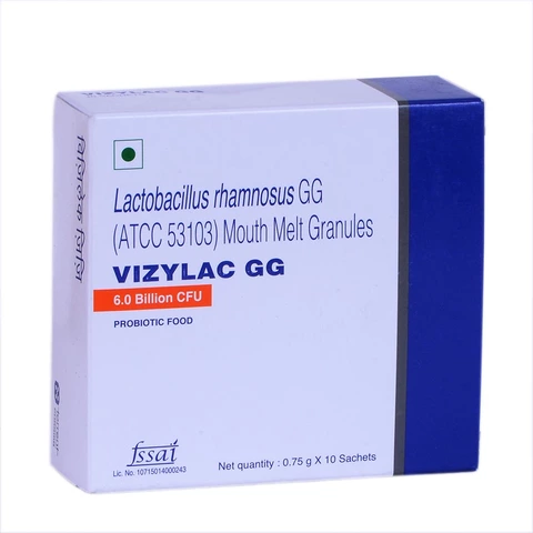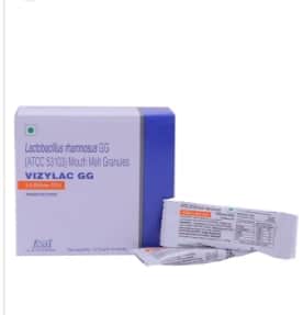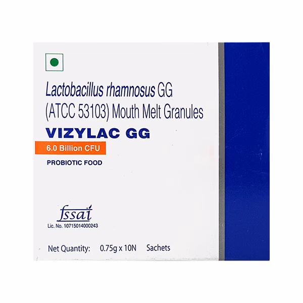 Vizylac GG Sachet 0.75 gm is a probiotic-based supplement formulated to support healthy digestion and maintain gut flora balance, particularly during or after diarrhoeal episodes. It is beneficial for managing both acute and chronic gastrointestinal discomfort caused by infections, antibiotic use, or food sensitivities. Containing Lactobacillus rhamnosus GG, one of the most clinically researched probiotic strains, this sachet helps restore intestinal balance, support immune health, and improve digestive comfort.