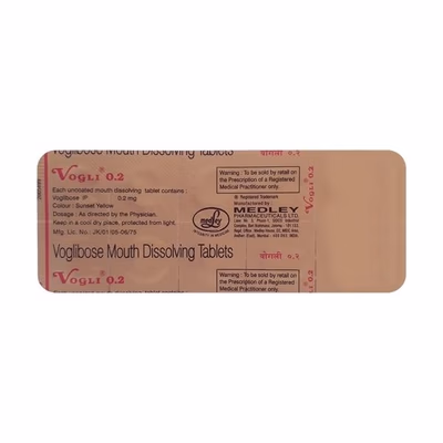 Vogli 0.2 Tablet MD is a prescription medicine used in the management of type two diabetes mellitus. It belongs to the group of alpha glucosidase inhibitors which help in controlling blood sugar levels, particularly after meals. This medicine works by slowing down the breakdown and absorption of carbohydrates from food in the intestine, which prevents sudden spikes in blood sugar after eating. It is usually prescribed when diet and exercise alone are not sufficient and can be combined with other anti-diabetic medicines for better control. Vogli 0.2 Tablet MD supports stable sugar levels throughout the day, reduces the risk of diabetes-related complications such as nerve problems, kidney damage, and vision issues, and helps patients live healthier with long-term diabetes care. Taken as per medical guidance, along with lifestyle changes, it offers effective support in keeping sugar levels under control.