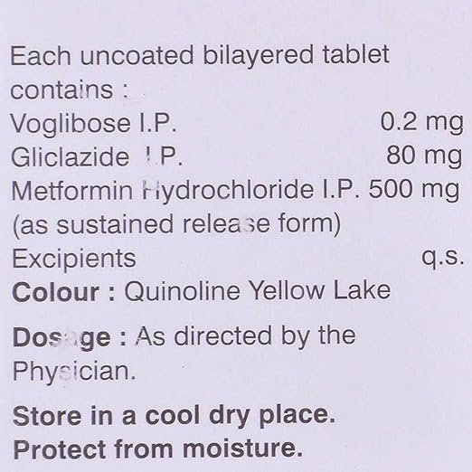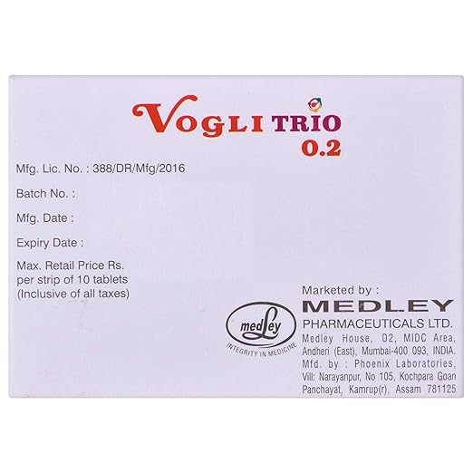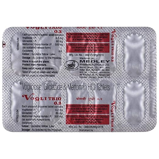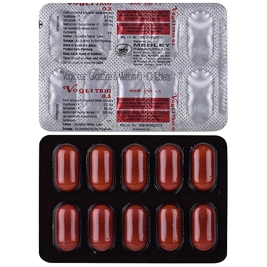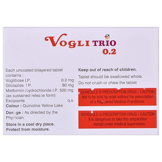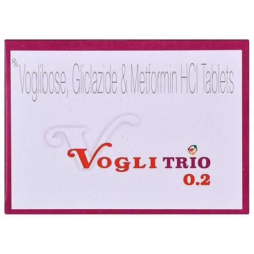 Vogli Trio 0.2 Tablet SR is a prescription medicine used to manage type two diabetes mellitus in adults. It combines three different medicines that act through complementary mechanisms to control blood sugar. This tablet contains an alpha glucosidase inhibitor which slows down the digestion and absorption of carbohydrates, a sulfonylurea which stimulates the pancreas to release more natural insulin, and metformin which reduces glucose production in the liver while improving the body’s sensitivity to insulin. The sustained release form ensures long-lasting sugar control throughout the day, preventing sudden spikes after meals. Vogli Trio 0.2 Tablet SR is generally recommended when diet, exercise, and single or dual medicine therapy are not sufficient. By keeping sugar levels balanced, it lowers the risk of long-term complications such as kidney disorders, nerve damage, heart disease, and eye problems. Regular monitoring and lifestyle modification along with this medicine ensures better management of diabetes.