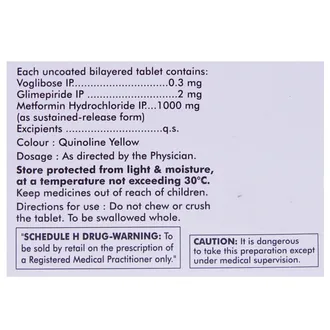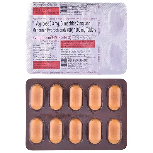 Voglinorm GM Forte 2 Tablet SR is a combination medicine used to control blood sugar levels in patients with type 2 diabetes mellitus. It contains a blend of medicines that work together to reduce post-meal sugar spikes and improve overall glucose management. This helps lower the risk of diabetes-related complications when diet and exercise alone are not sufficient.