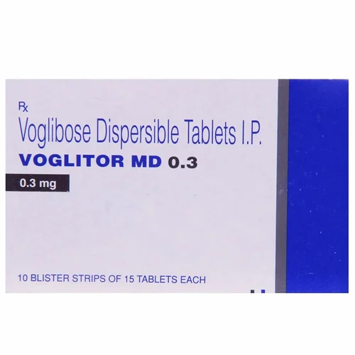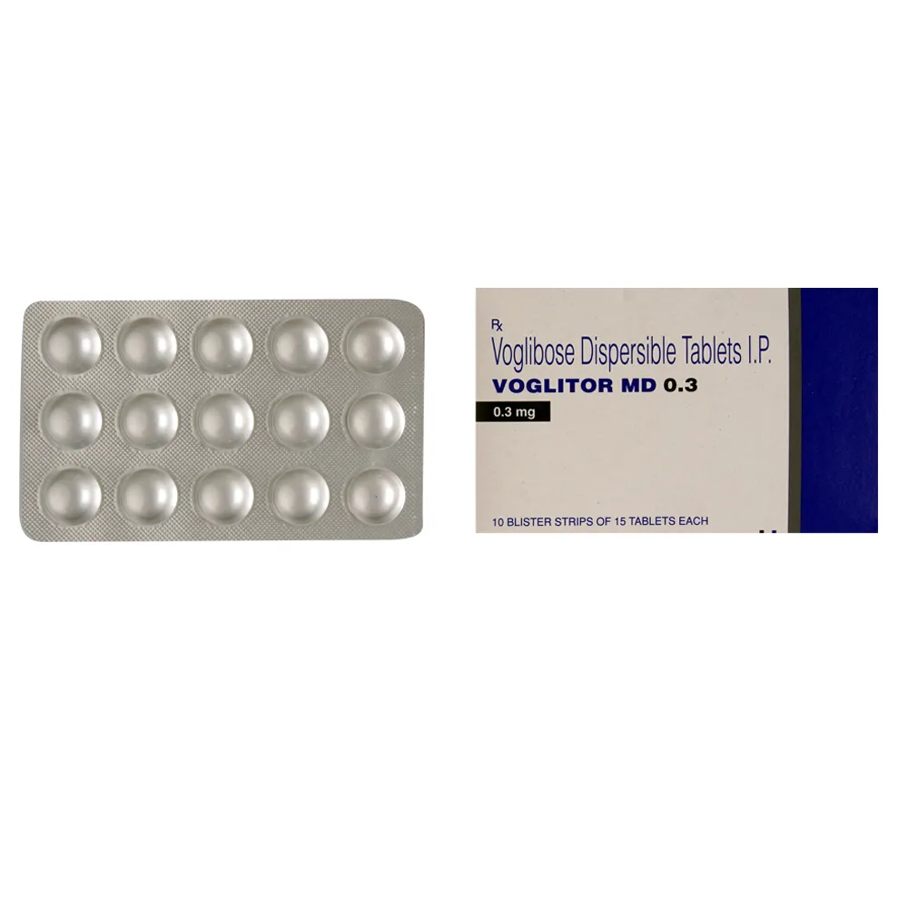 Voglitor MD 0.3 Tablet is an advanced oral anti-diabetic medication specifically formulated for individuals managing type 2 diabetes mellitus. Designed to reduce blood sugar spikes that occur after meals, this medicine enhances postprandial glucose control when diet, exercise, and other first-line treatments fall short. The key component in Voglitor MD 0.3 Tablet is voglibose, a potent alpha-glucosidase inhibitor. It works directly in the small intestine to slow the breakdown of complex carbohydrates into glucose, preventing sudden elevations in blood sugar levels immediately after eating. Voglitor MD 0.3 Tablet controls post-meal glucose spikes, reduces the absorption of sugar after meals for more stable blood glucose levels throughout the day, and supports long-term diabetes management by minimizing the risk of complications such as diabetic neuropathy, retinopathy, and kidney impairment. Acting locally in the gut with minimal systemic absorption, it offers a favorable safety profile and complements controlled diet and exercise regimens without interfering with nutritional goals. By stabilizing glucose swings, it helps maintain daily energy and focus. Take Voglitor MD 0.3 Tablet before meals or as directed by your physician. Place the tablet on your tongue and allow it to dissolve; do not swallow whole, crush, or chew. Handle with dry hands and take it consistently at the same times daily for best results. This tablet is suitable for adults with type 2 diabetes mellitus whose blood glucose remains uncontrolled despite lifestyle changes and other medications. It is not for type 1 diabetes or diabetic ketoacidosis. Common side effects include gas, bloating, abdominal discomfort, diarrhea or constipation, and occasional skin irritation. These are usually mild and temporary; consult your healthcare provider if they persist. Pregnant or breastfeeding women should consult their doctor before use. Avoid alcohol during treatment as it may increase the risk of low blood sugar. While driving, monitor for hypoglycemia especially if combined with other antidiabetic drugs. Use cautiously if you have kidney or liver problems, as dose adjustments may be necessary. If you miss a dose before a meal, skip it and resume your normal schedule. Do not double the dose. Store in a cool, dry place between 10°C and 30°C, away from sunlight and out of children’s reach.